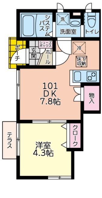 | 築年月 | 2021年3月 | 間取り | 1DK( 洋室4.3畳/DK7.8畳 ) | 専有面積 | 29.56m2 |