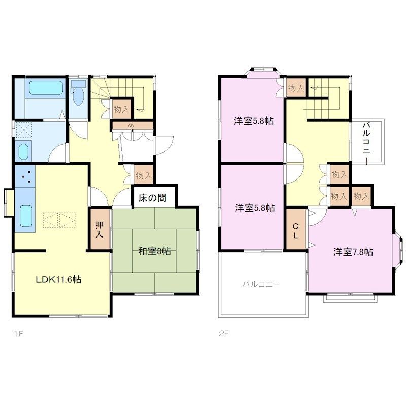 | 築年月 | 1980年4月 | 間取り | 4LDK( LDK11.6畳(1階)/和室8畳(1階)/洋室5.8畳(2階)/洋室5.8畳(2階)/和室7.8畳(2階) ) | 専有面積 | 108.54m2 |