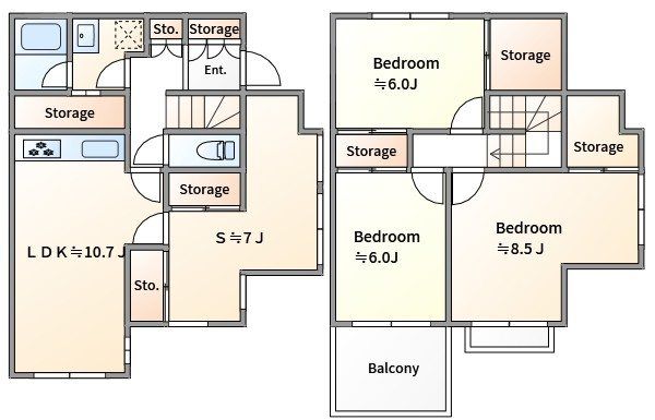 | 築年月 | 1988年8月 | 間取り | 3SLDK( LDK10.7畳(1階)/S7畳(1階)/和室6畳(2階)/和室6畳(2階)/洋室8.5畳(2階) ) | 専有面積 | 98.53m2 |