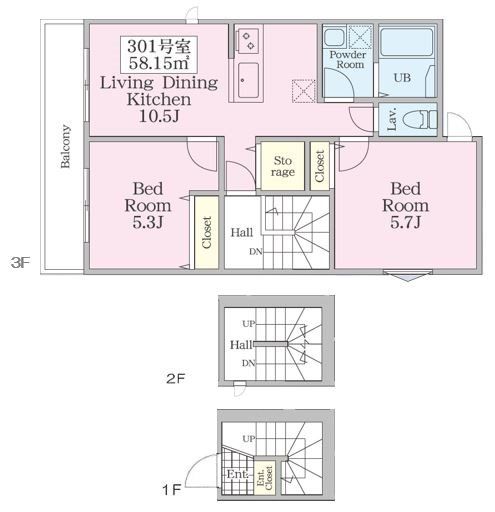 | 築年月 | 2023年3月 | 間取り | 2LDK( 洋室5.7畳(3階)/洋室5.3畳(3階)/LDK10.5畳(3階) ) | 専有面積 | 58.52m2 |
