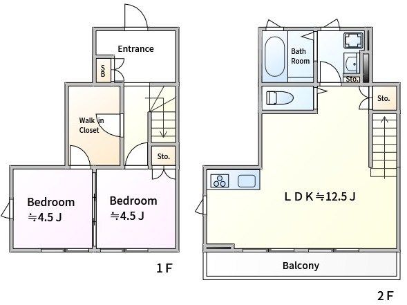 | 築年月 | 2021年8月 | 間取り | 2LDK( LDK12.4畳(2階)/洋室4.5畳(1階)/洋室4.5畳(1階) ) | 専有面積 | 61.27m2 |